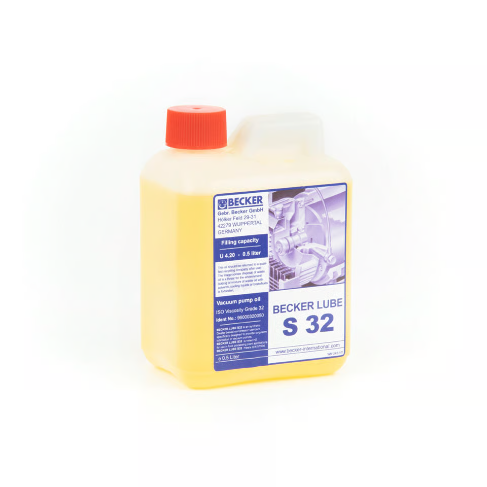 Becker Original Oil 96000320050 The container size is 0,5 L litre. To ensure proper function of your Becker pump, the oil has to be changed regularly according to the operation manual.